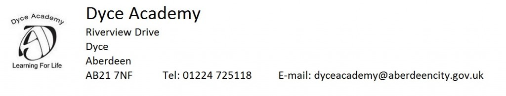 Riverview Drive, Dyce, Aberdeen, AB21 7NF - Tel: 01224 725118 - Email: dyceacademy@aberdeencity.gov.uk